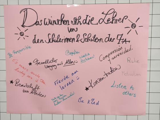 Die Schülerinnen und Schüler der Klasse 7a haben in den letzten Wochen unter der Leitung der Klassenlehrerin Frau Piguet und in Zusammenarbeit mit unserer Schulpsychologin Frau Ámbar García, fächerübergreifend zum Thema „Eine Gemeinschaft bilden – Toleranz und Respekt leben“ gearbeitet. Im Klassenraum hängen jetzt die Wünsche der Schülerinnen und Schüler und die der Lehrerinnen und Lehrer, damit wir alle zusammen unsere Klassengemeinschaft verbessern können. Wir sind gemeinsam auf einem sehr guten Weg!