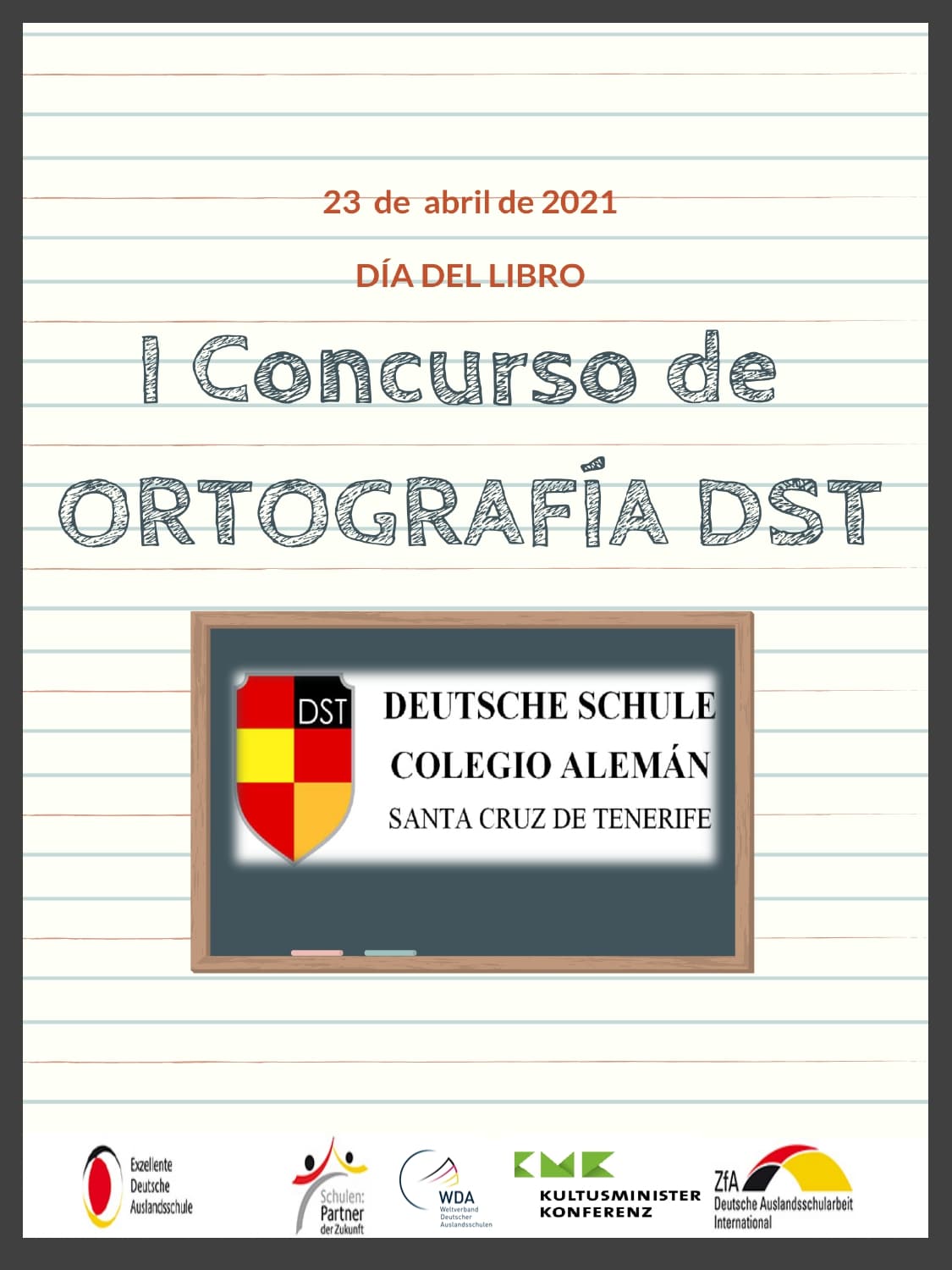Die Fachschaft Spanisch der Deutschen Schule Santa Cruz de Tenerife organisiert seinen ersten Rechtschreibwettbewerb für alle Schülerinnen und Schüler der Klassen 3 bis 11. Die Gewinner werden am 23. April 2021, Tag des Buches, spezielle Preise erhalten! Alle Informationen zum Wettbewerb finden Sie hier: